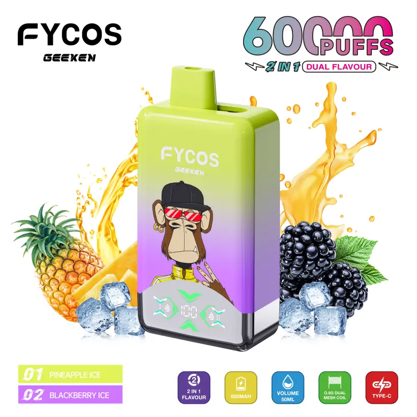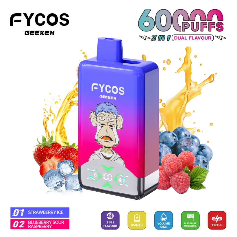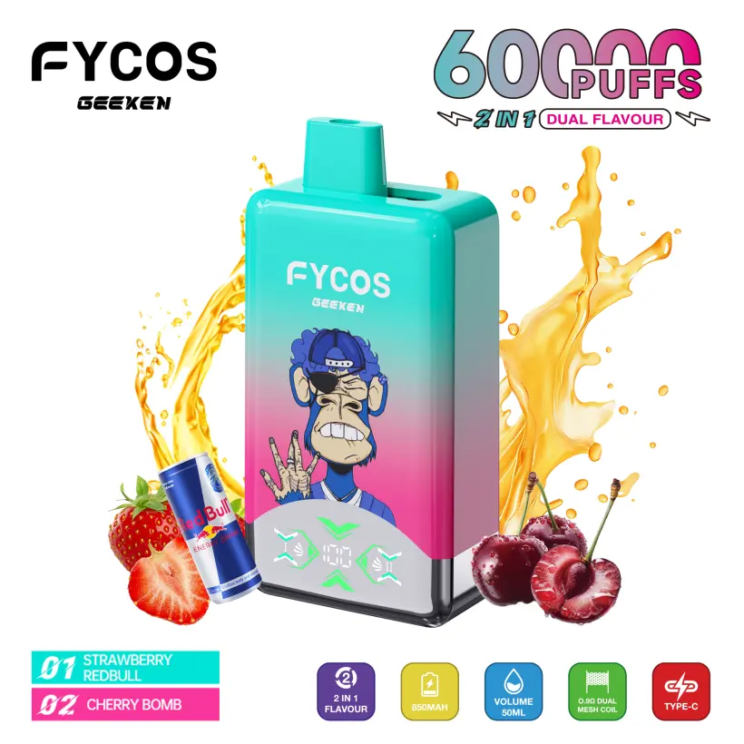 EU Vape FYCOS 60000 Puffs, with 5% nicotina, delivers an excellent smoking experience. It has dual mesh coils inside, providing rich taste and smooth smoke. With a 850mAh Type-C batería, ofrece hasta 60.000 caladas de larga duración.