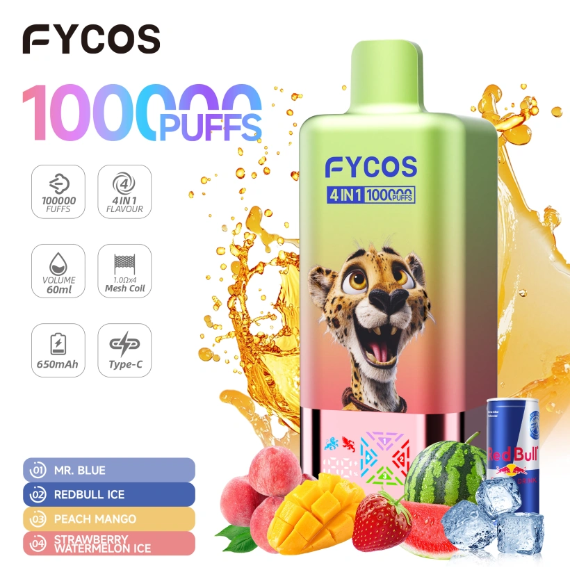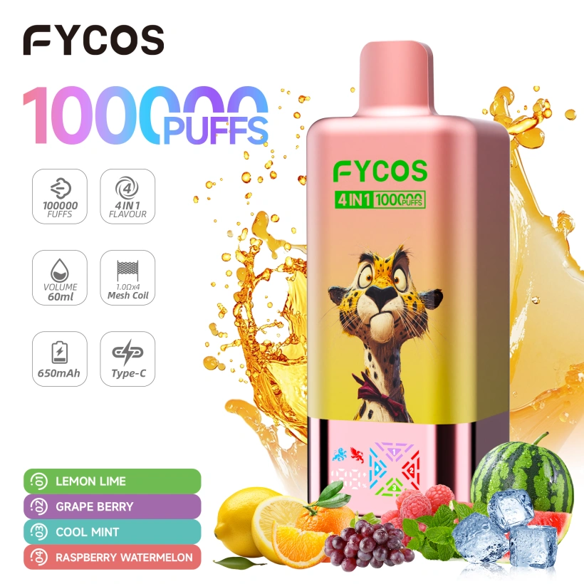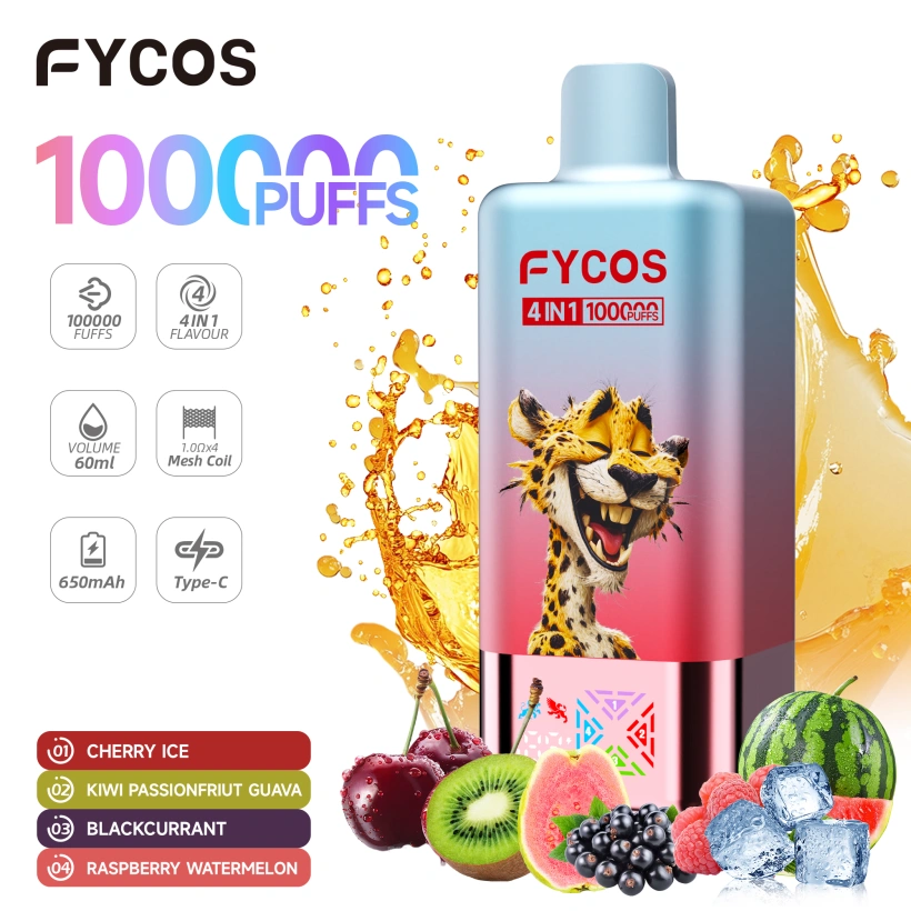 EU Vape FYCOS 100K Puffs 4 in 1 , with 5% nikotin, kiváló dohányzási élményt nyújt. Belsejében kettős hálós tekercs van, amely gazdag ízt és sima füstöt biztosít. A 650mAh Type-C akkumulátor, akár 100,000 hosszan tartó fújás.